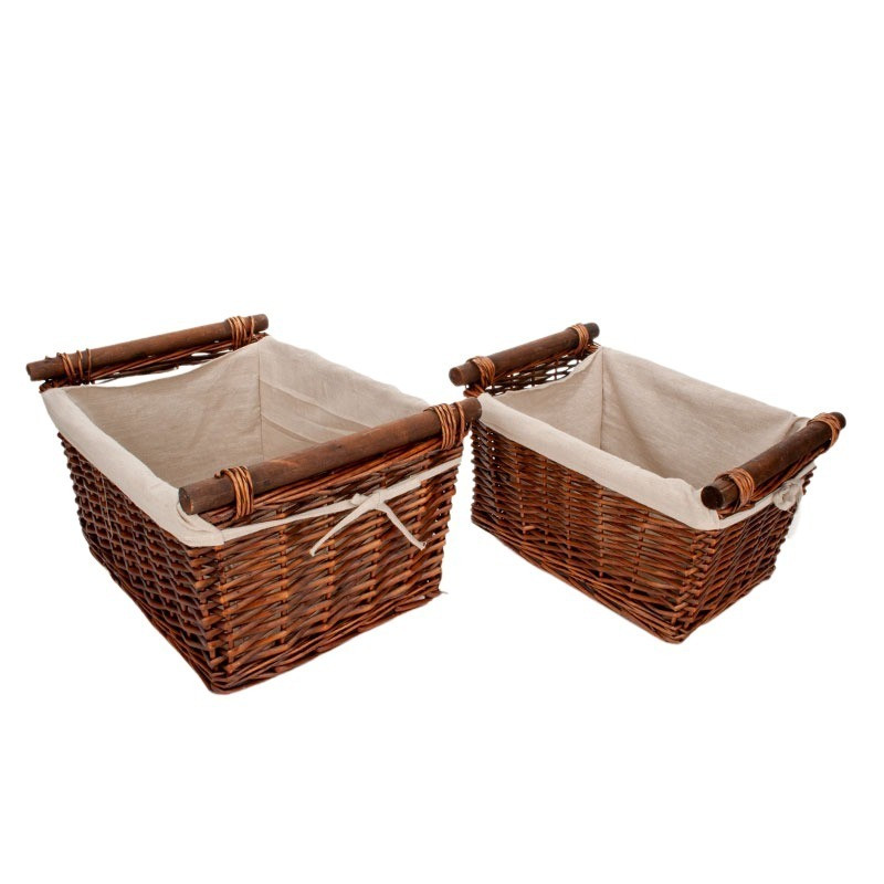 szögletes hasított vessző tál szett fa füllel textil béléssel barna 45x35x23/26cm S/2
